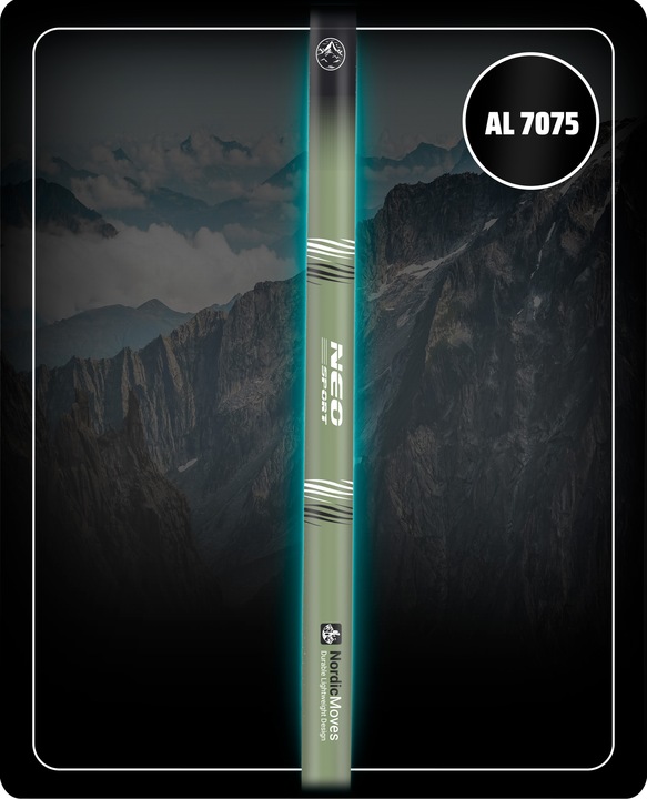 Алюмінієвий сплав AL 7075 використовується для оптимальної ваги та міцності. Вага однієї палиці становить лише 0,355 кг, що забезпечує легкість у використанні. AL 7075 є одним із найміцніших алюмінієвих сплавів, який часто порівнюють зі сталлю, тому трекінгові палиці, виготовлені з цього матеріалу, демонструють виняткову міцність навіть у складній місцевості. Незважаючи на високу міцність, алюміній 7075 залишається надзвичайно легким і стійким до корозії, що гарантує надійність під час походів у вологих умовах, під дощем чи снігом.