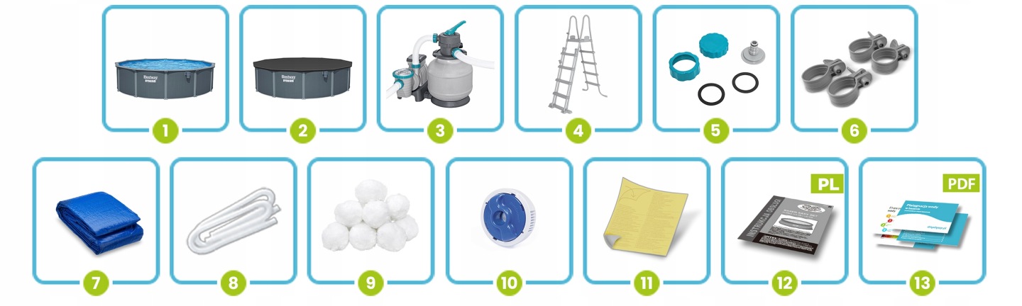Сталеві панелі забезпечують виняткову стабільність і довговічність. Покриття з ПВХ стійке до механічних пошкоджень, ультрафіолету та хімії для басейнів. Елегантний дизайн гармонійно вписується в будь‑який двір, а внутрішнє дно прикрашене мозаїчним візерунком у біло‑синій гамі, що додає естетики та створює приємну атмосферу для купання. Це матеріали, які гарантують довговічність та надійність.