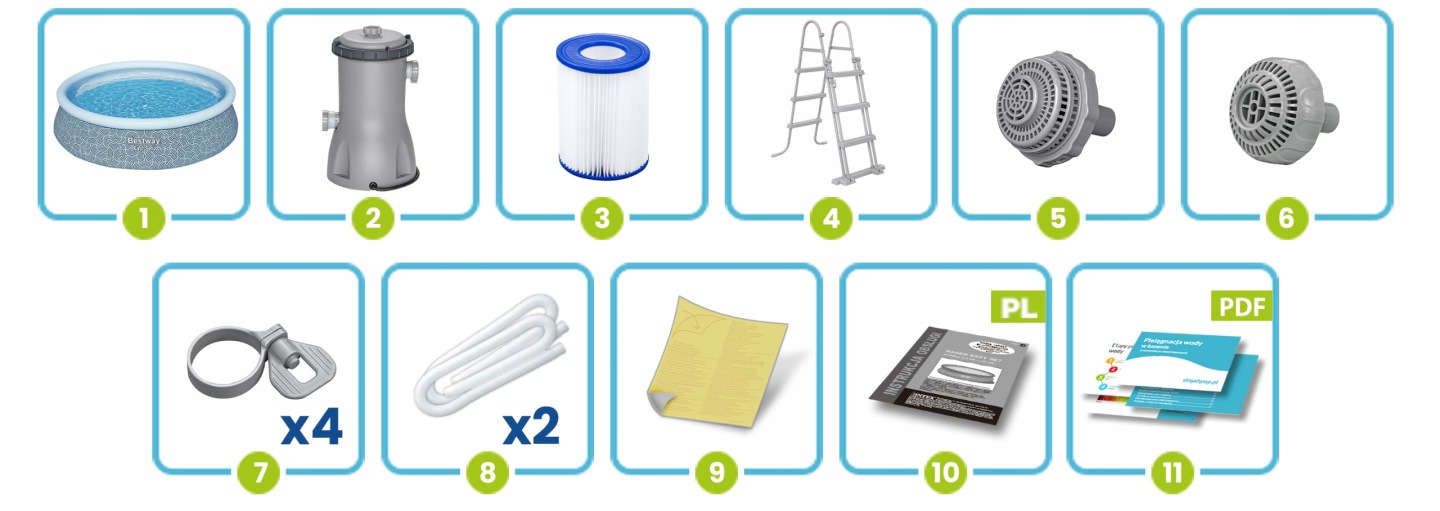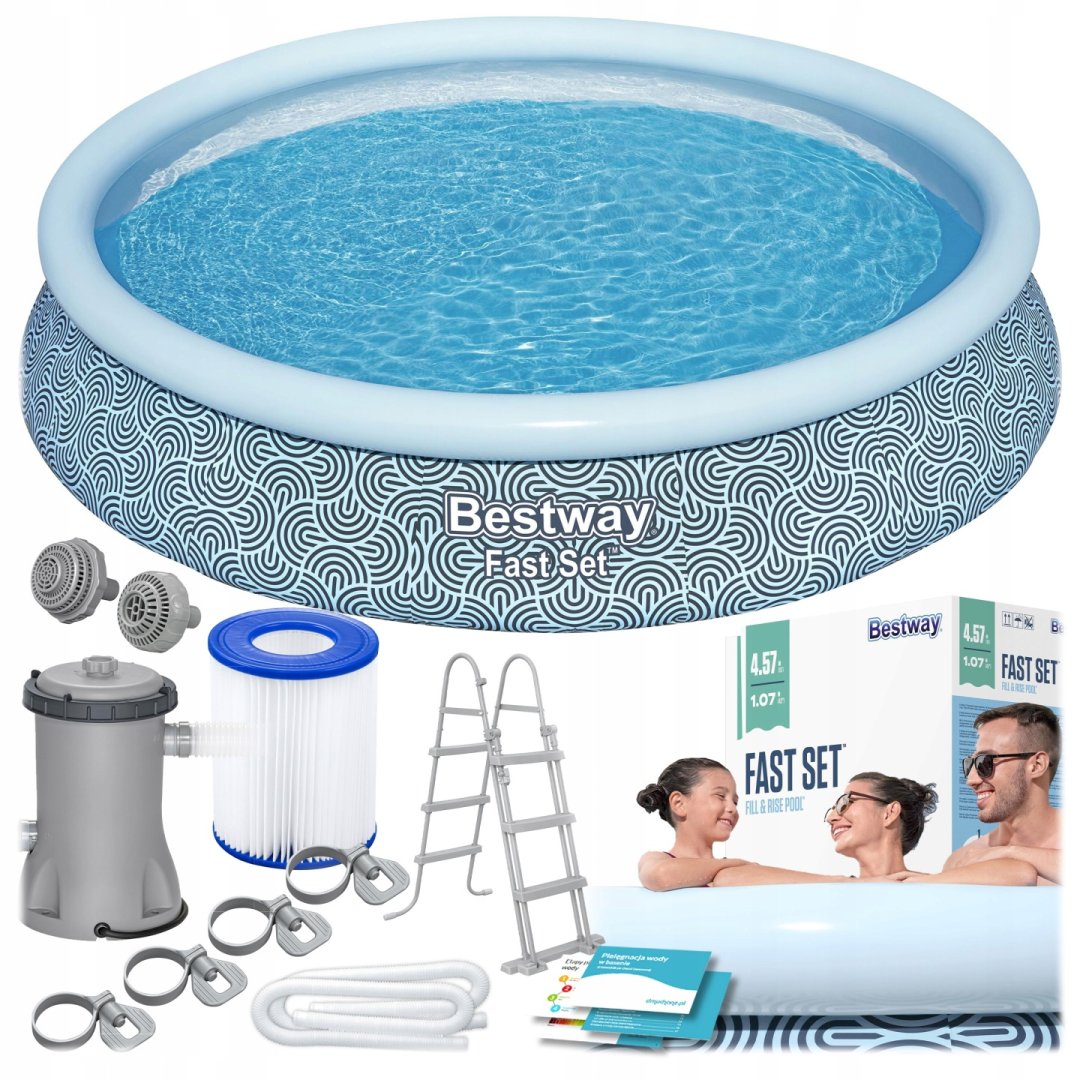 Басейн надувний 11в1 Bestway 57372 457 х 107 см — це просторий розпірний басейн діаметром 457 см і висотою 107 см, створений для справжнього сімейного відпочинку. Його міцна тришарова конструкція PVC Tritech гарантує довговічність, а потужна фільтруюча помпа та багатий набір аксесуарів забезпечують комфорт і чистоту води з першого дня використання. Завдяки продуманому комплекту басейн готовий до купання одразу після встановлення, даруючи відчуття власного міні‑аквапарку у вашому саду.Вміст комплекту